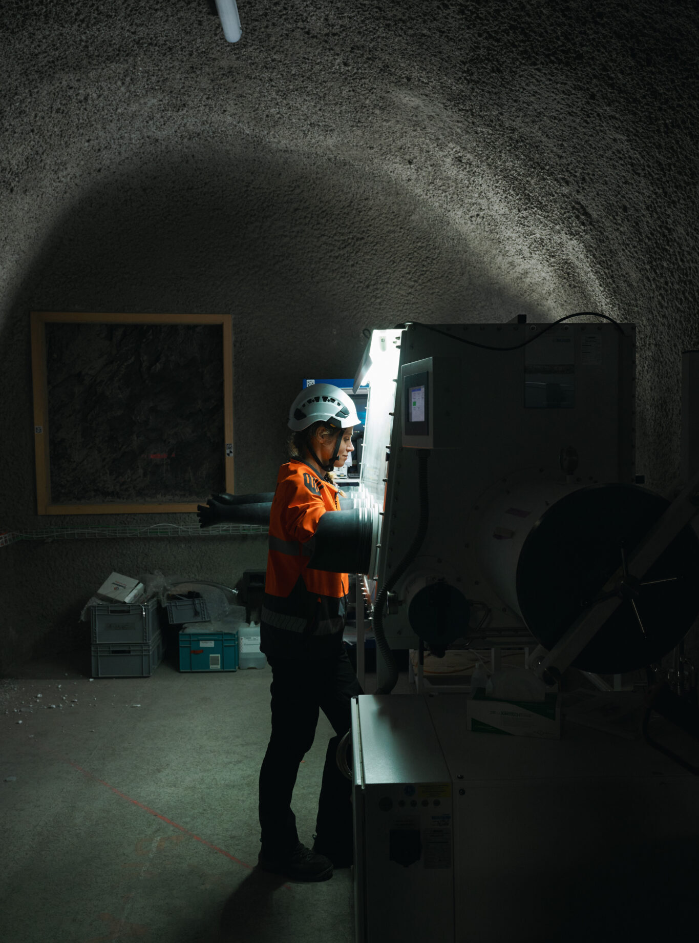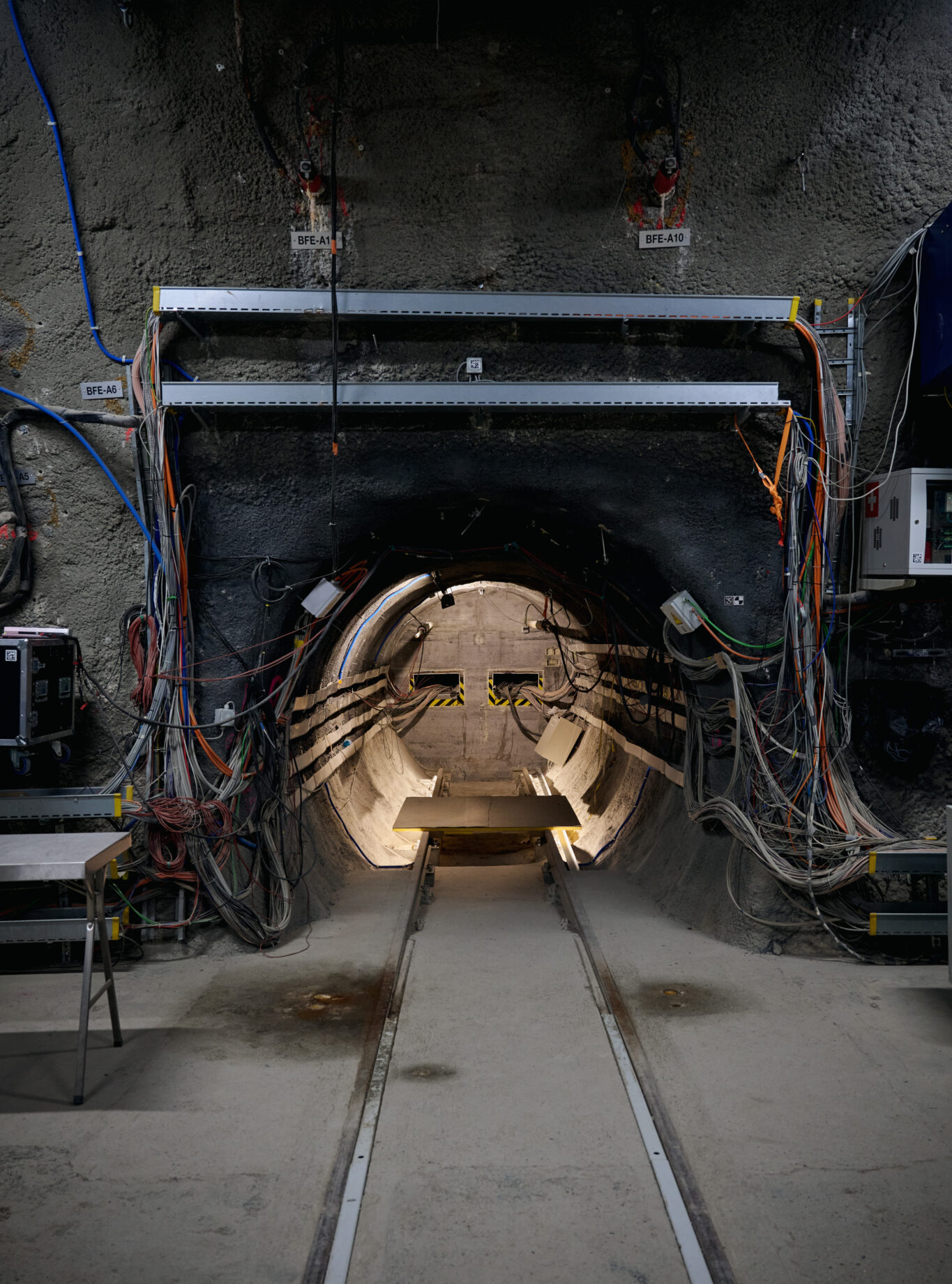 Irina Gaus is responsible for approaching these one hundred per cent. The Belgian has worked at Nagra for 18 years and has entered the mountain, the absolute silence, the maze of tunnels where it is easy to lose your bearings, countless times. Ear-protection dispensers, reminiscent of classic chewing gum machines, reveal that it has not always been as quiet as it is today. The machine dispenses coloured ear plugs when you turn the wheel. In Mont Terri, half the world works together to research topics relating to the disposal of radioactive waste. Researchers from Japan are taking the pulse of the mountain just like their counterparts from Germany, the USA and Canada. On the way to Nagra’s tunnel, we pass drill cores packed in wooden crates waiting for shipment, cables protruding from the rock all over the place, and windows built into the rock: wooden frame, Plexiglas and, for once, no shotcrete. Nagra is specifically researching how a repository can be constructed in the Opalinus Clay and determining which machines and techniques would be suitable for this purpose. At the same time, research is continuing into the processes that will take place in a deep geological repository.